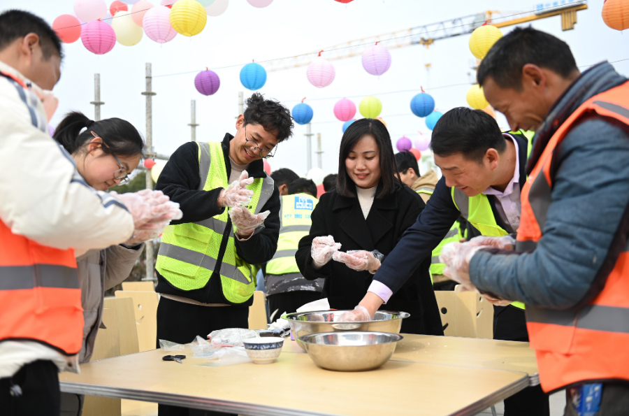 2023年2月4日,临平区东湖街道康盛社区的青年志愿者与建设者在兴起路公租房项目工地一同包汤圆。