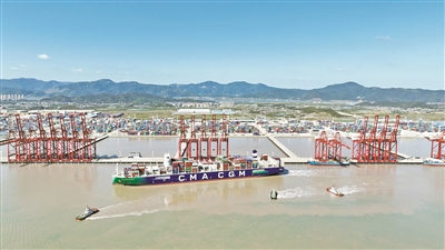 “达飞协和广场”轮靠泊宁波舟山港梅山港区。(汪舒婷 单玉紫枫 摄)