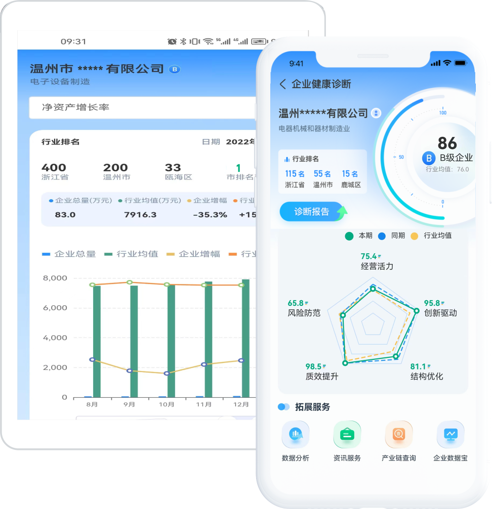 打开由温州市统计局打造的“企业健康诊断”应用,企业即可查看“经营活力、创新驱动、结构优化、质效提升和风险防范”等5个维度评价体系、33项指标,还可实时掌握自身发展健康状态、行业区域排名、重点指标走势和风险短板预警等信息。