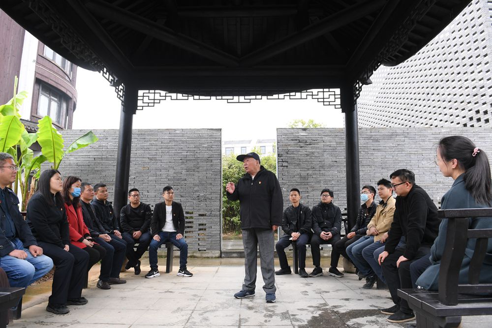 浙江省诸暨市枫桥镇魏廉村老党员魏杏根(中)在枫桥经验陈列馆的亭子内和年轻党员分享当年运用“枫桥经验”化解基层矛盾的故事(2021年4月11日摄)。新华社记者 翁忻旸 摄