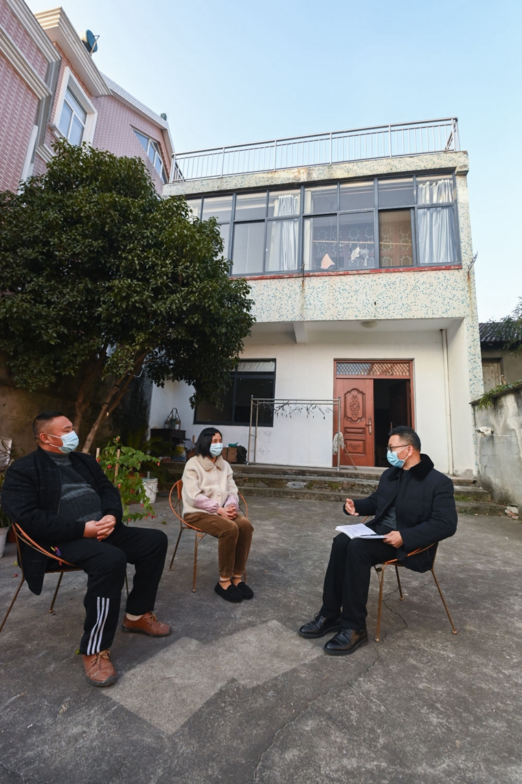 浙江省湖州市吴兴区道场乡老潘调解工作室的调解员潘水方(右)在钱山下村村民家中进行回访(2023年1月12日摄)。新华社记者 徐昱 摄