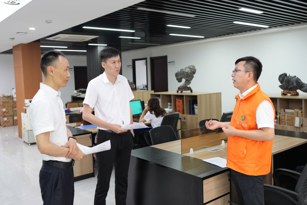 “徽商义警”张勤波(右)在一家徽商企业走访,了解其在运营中遇到的问题(2023年5月26日摄)。浙江省诸暨市公安局徽商警企联络室成立于2020年,由徽商代表组成,目前共有210名“徽商义警”,为在诸暨经商务工的7.5万名同乡提供经济、治安类调解服务。新华社记者 翁忻旸 摄