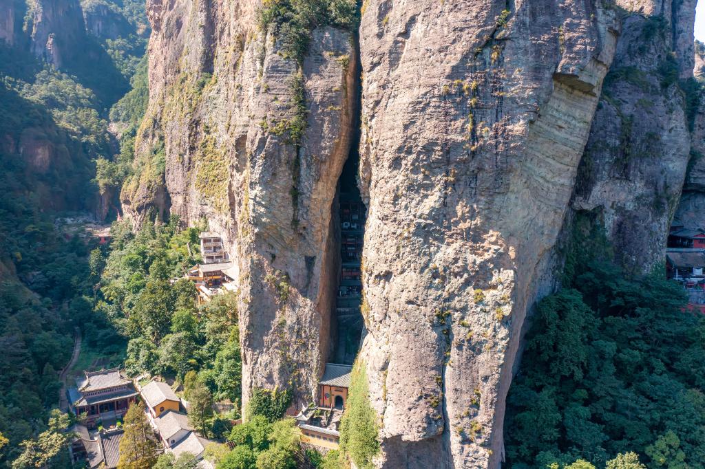 藏在合掌峰中的观音洞(无人机照片)。 新华社记者 李泽欣 摄