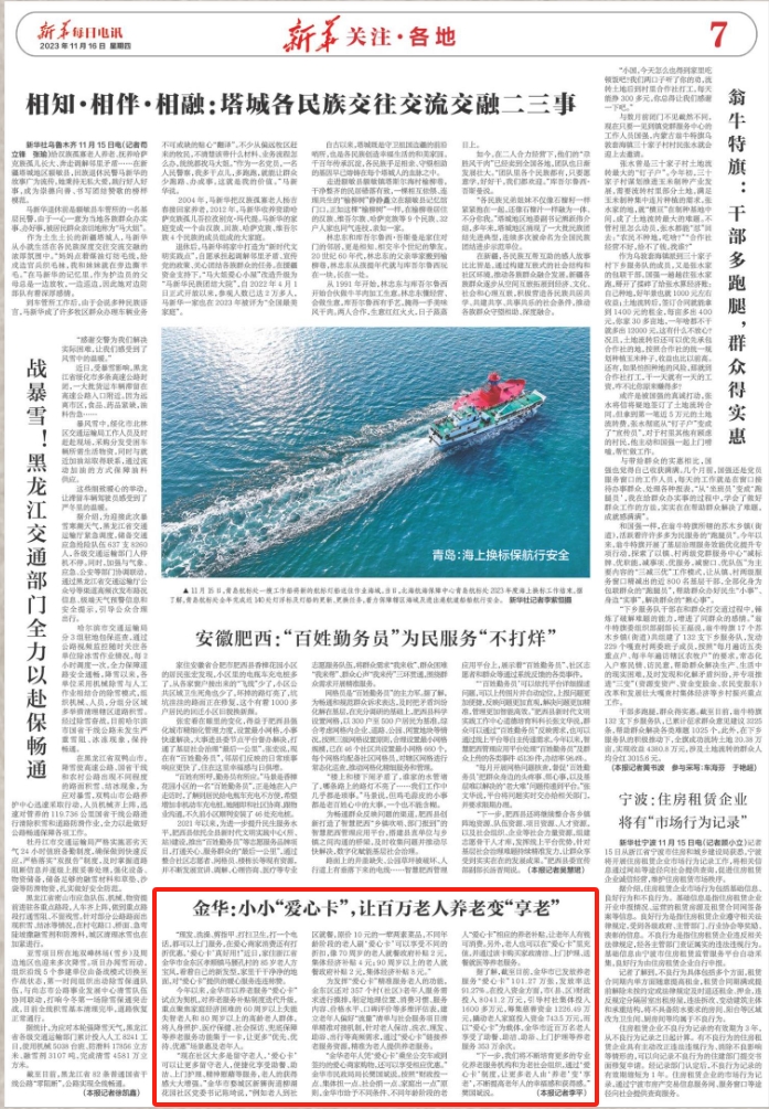 今年以来,金华市以养老服务“爱心卡”试点为契机,对养老服务补贴制度迭代升级,重点聚焦家庭经济困难的60周岁以上失能失智老人和80周岁以上的高龄老人群体,将人身照护、医疗保健、社会探访、兜底保障等养老服务功能集于一卡,让更多“优先、优待、优惠”场景惠及老年人。