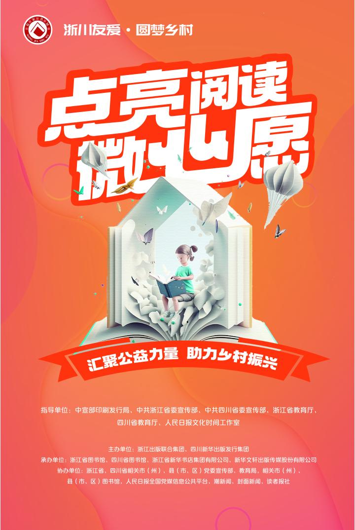 “浙川友爱·点亮阅读微心愿”由中宣部印刷发行局、浙江省委宣传部、四川省委宣传部、浙江省教育厅、四川省教育厅、人民日报文化时间工作室指导,浙江出版联合集团、四川新华出版发行集团主办,浙江省图书馆、四川省图书馆、浙江省新华书店集团有限公司、新华文轩出版传媒股份有限公司、人民日报全国党媒信息公共平台共同承办。
