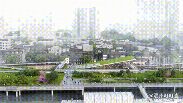 景观上有震撼力,文化上有感召力。江堤之上一片郁郁葱葱,公园与周边街景、建筑融为一体,划过的每一帧都是温州千年商港文化的极致浓缩。