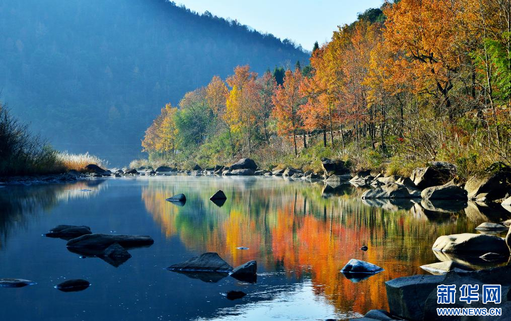 枫树沿溪而立,红得浓烈、绚烂。新华网发 永嘉县委宣传部供图