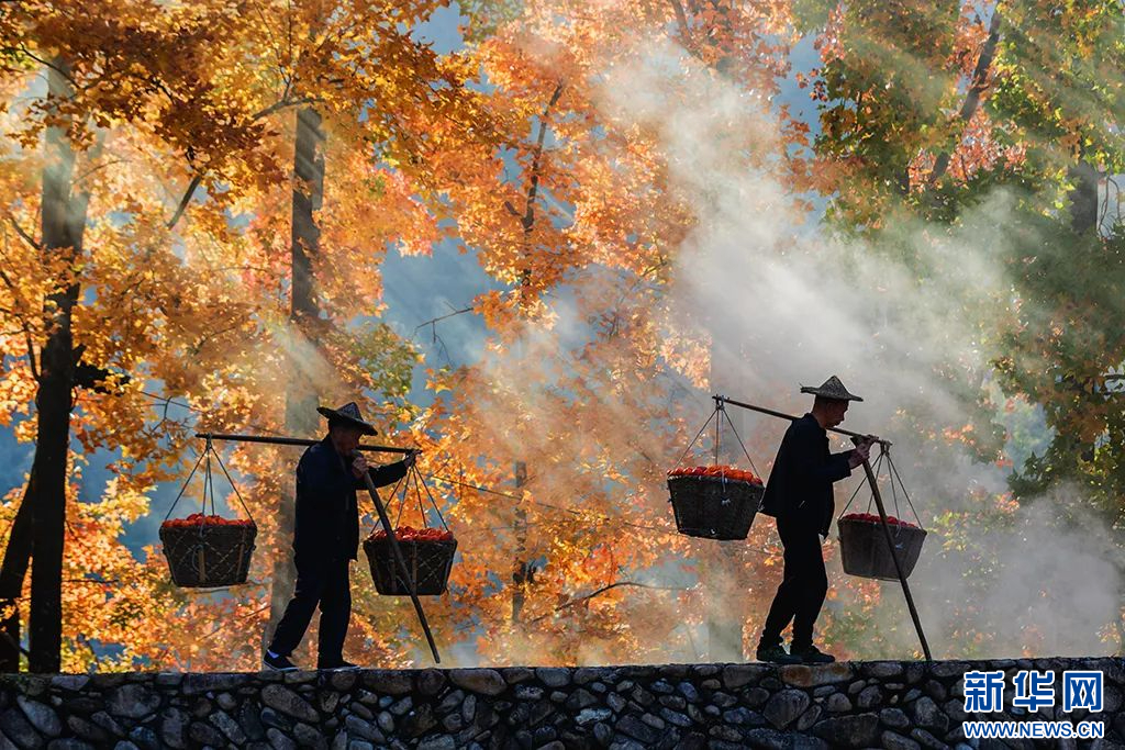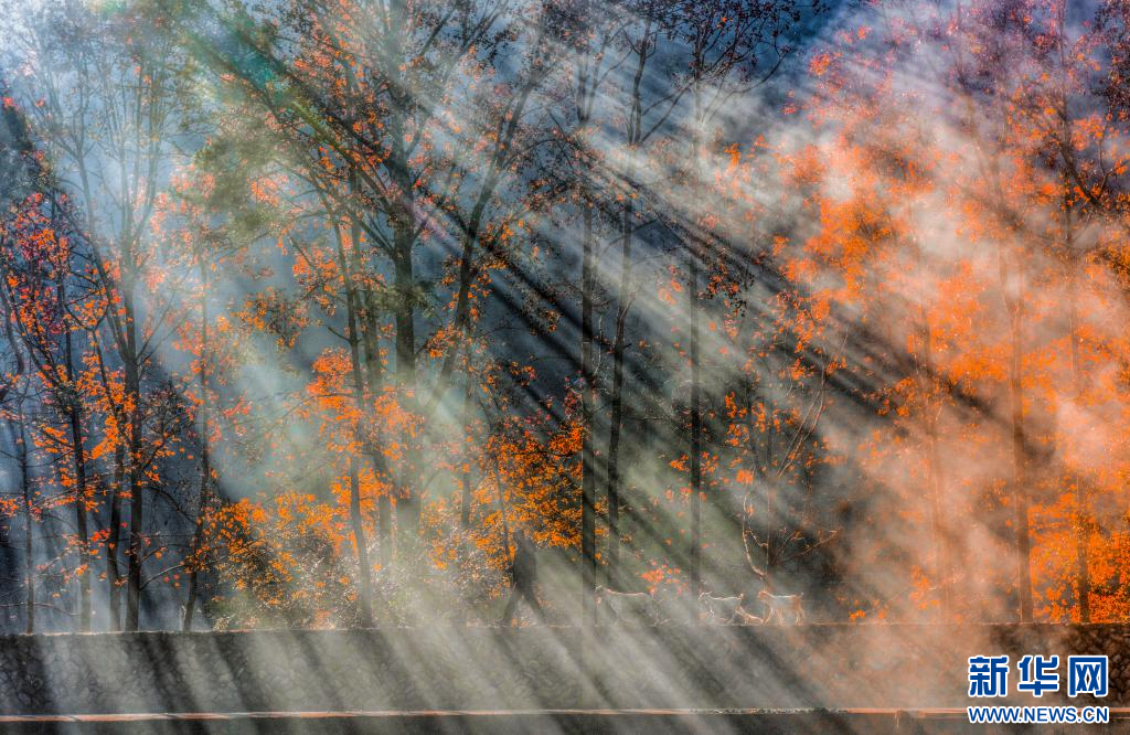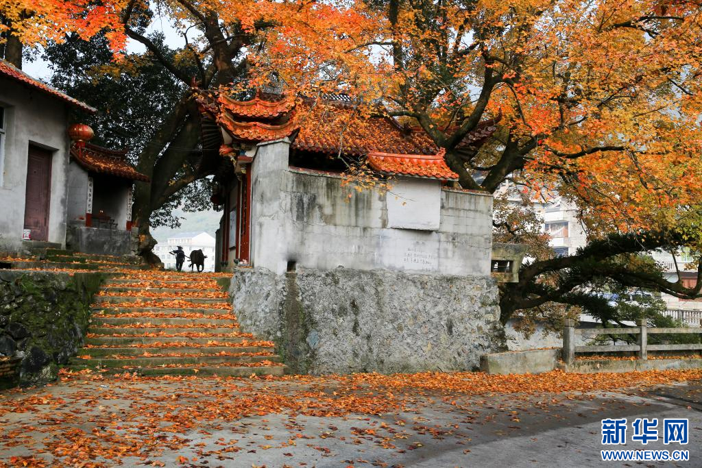 阳光穿过枫叶的间隙,洒下斑驳的光影,披在路过的人身上。新华网发 永嘉县委宣传部供图