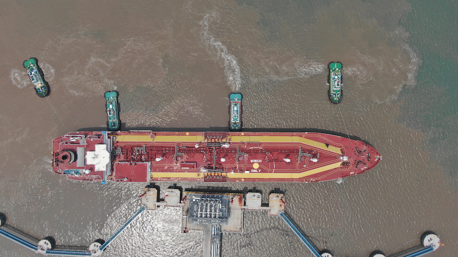 2023年8月,温州液化天然气(LNG)接收站项目配套码头(15万总吨级)迎来首艘LNG船舶——YARI LNG(雅锐)轮,标志着浙南地区建设规模最大、泊位吨级最高,浙江第四座、浙南首座LNG码头正式运营。新华网发 温州市港航管理中心供图