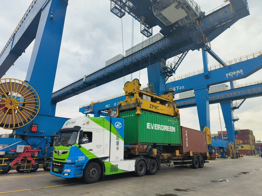 2022年,嘉兴港乍浦港区20辆氢能重卡总共完成作业量超过27万标准箱、节约燃料成本约40万元、减少碳排放500吨。2023年6月,该港区新增投用30辆氢能重卡。新华网发 宁波舟山港集团供图