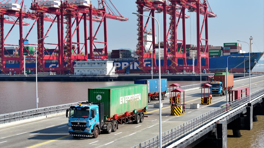 宁波舟山港梅山港区无人集卡正在有序作业。2023年10月,“2023年中国港口协会智慧港口等级评价评审结果”发布公告,宁波梅东集装箱码头有限公司被中国港口协会评为全国四星级“智慧港口”,为浙江首例。新华网发 宁波舟山港集团供图