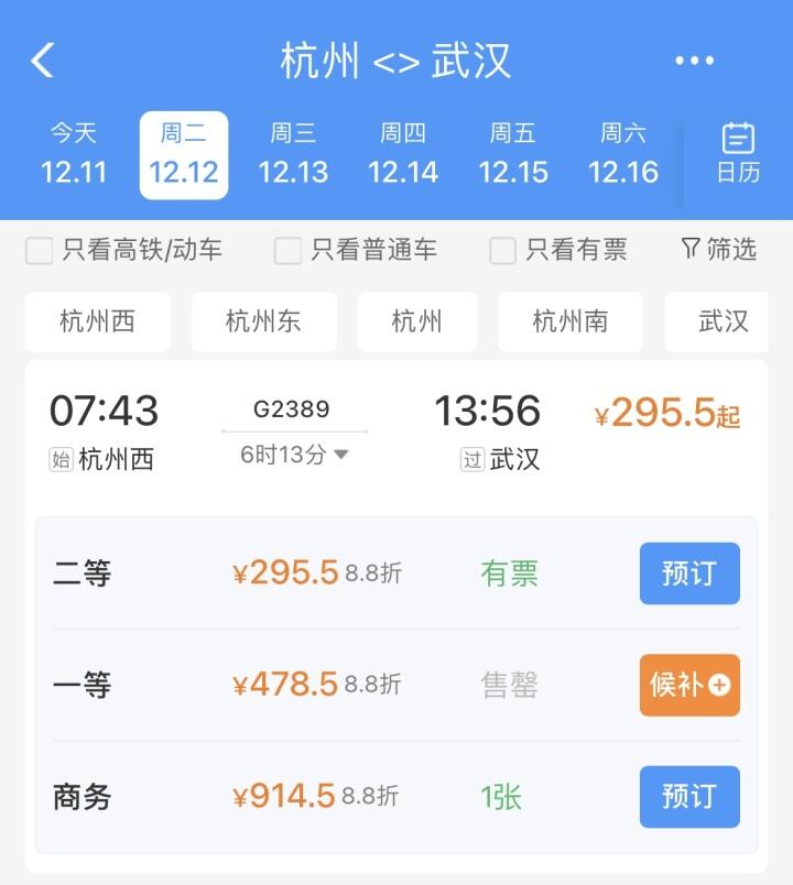以12月12日杭州至武汉的高铁票为例,早上7时19分,从杭州西站发车的G1544次列车,二等座票价为313元,全程运行时间为4小时15分,票价后面标注9.2折;7是43分从杭州西发车的G2389次列车,二等座票价为295.5元,运行时间6时13分,显示折扣8.8折。而9时13分从杭州东发车的G590次列车,二等座票价为342元,全程运行时间4小时51分,无折扣。