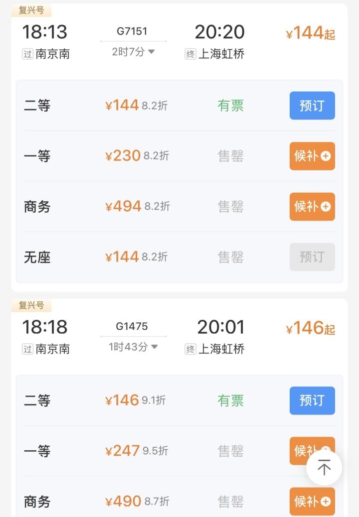 李先生购买的是12月15日18时18分从南京南前往上海虹桥的高铁票,运行时长1小时43分,根据购票系统显示,二等座票价为146元,打了9.1折。
