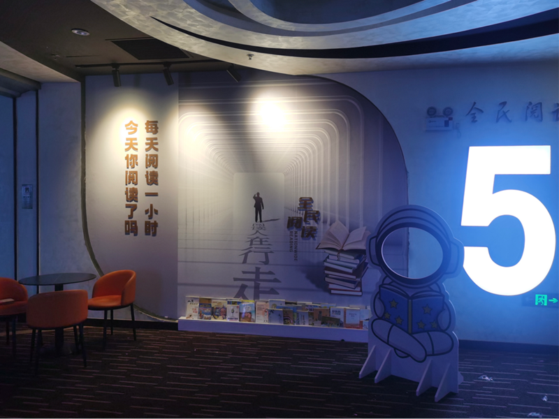 走进万达影城,便可看到阅读主题墙的书架上摆放着各类书籍,沿着指示牌一路走到5号全民阅读厅,“每天阅读1小时”的标语也格外醒目。