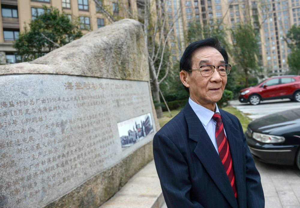 步鑫生在海盐衬衫总厂厂址纪念碑前(2013年11月10日摄)。新华社记者韩传号摄