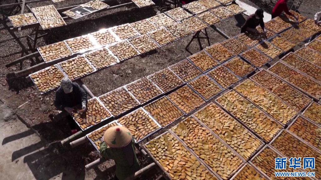 番薯蒸好出锅后,村民们会将番薯均匀切片,整齐地码放在篾帘上晾晒,期间还要根据晾晒程度多次翻面。