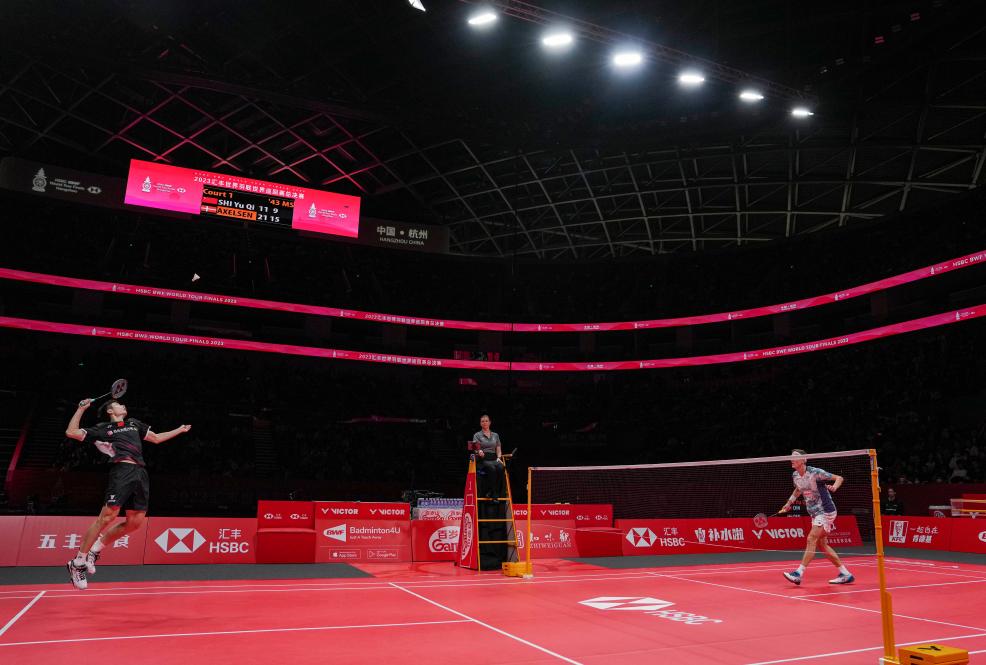 12月17日,石宇奇(左)和安赛龙在杭州举行的2023世界羽联世界巡回赛总决赛男子单打决赛中。新华社记者 孙非 摄