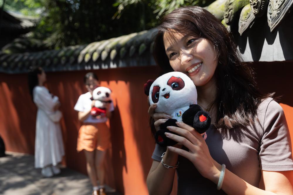 7月19日,游客手捧成都大运会吉祥物“蓉宝”在杜甫草堂的红墙边留影。新华社记者 江宏景 摄