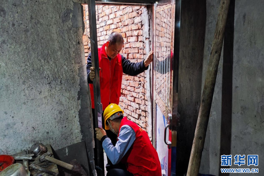 江国清和志愿者江勇兵为江小东换新门。新华网发