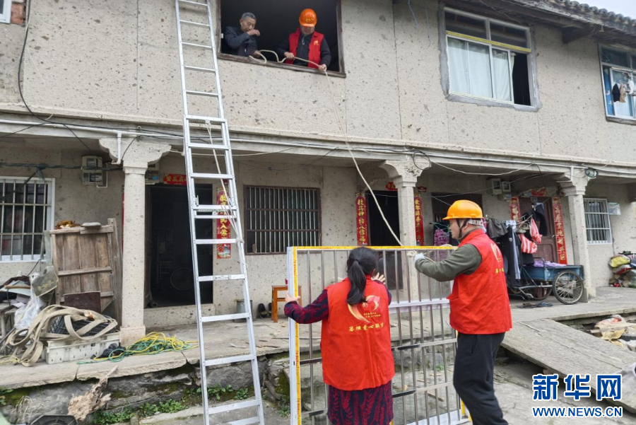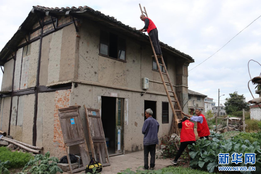 江国清与队员江冬春等人为困难老人修缮房顶。新华网发