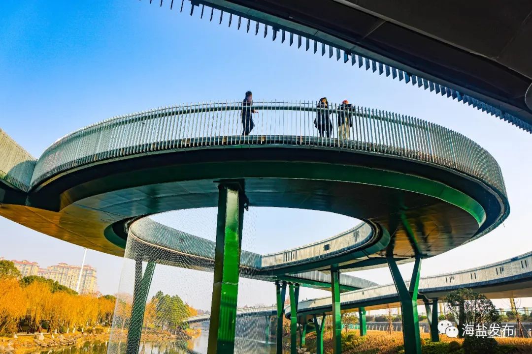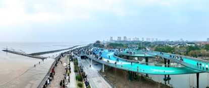 经过近10个月的建设,“敕海观塘”城市阳台启用。该城市阳台面积约6500平方米,东侧紧邻杭州湾,共有三层观赏平台,最高层达13.1米,可同时容纳6000人观赏最美日出,并建设7个出入口,分别设置在滨海大道和堤岸两侧,游客可以置身其中以最佳的视角观看杭州湾最美日出,同时还能深入了解千年鱼鳞石塘及海盐本地悠久的历史文化。