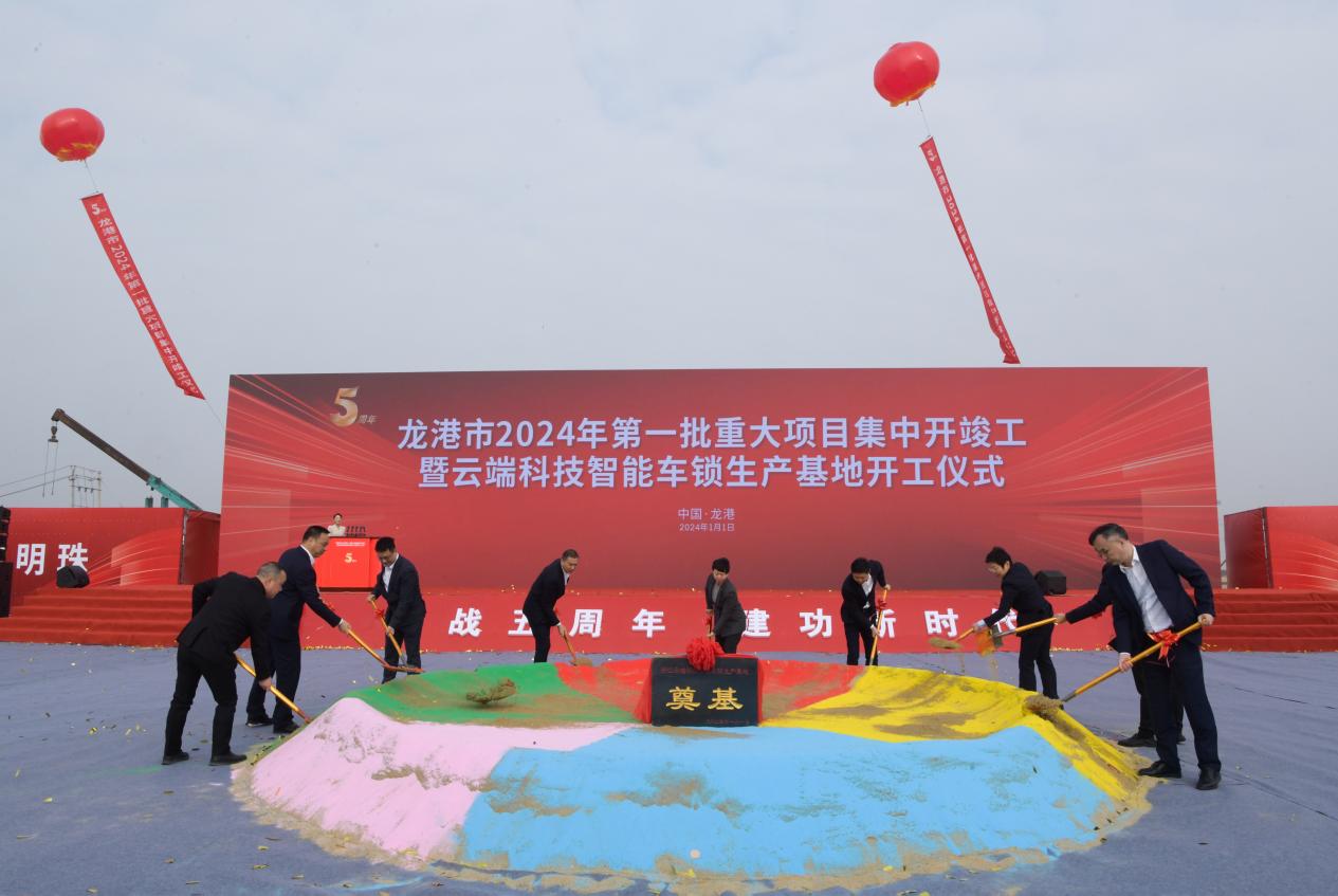 1月1日,浙江省龙港市2024年第一批重大项目集中开竣工暨云端科技智能车锁生产基地开工仪式举行,涉及重大项目66个,总投资约415亿元,旨在为龙港新一轮高质量发展注入强大动能。