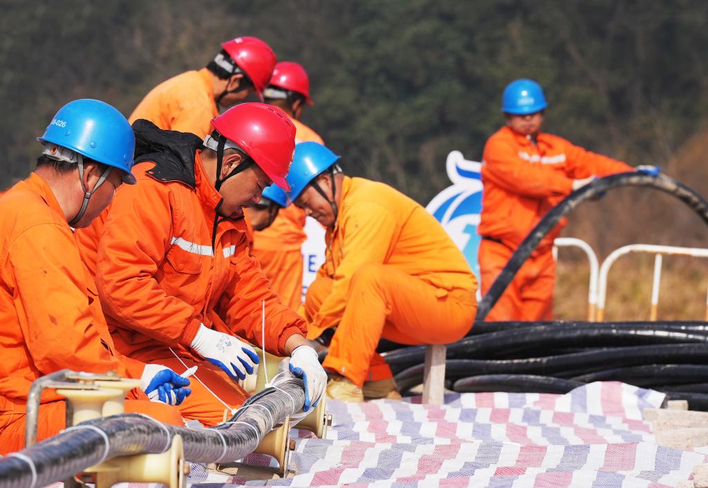 工人在陆缆穿海工程现场施工。(张帆 摄)