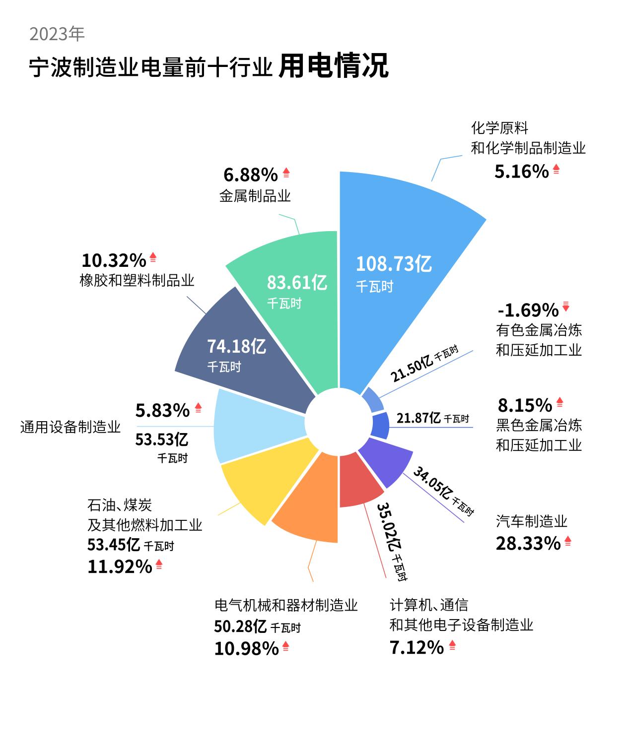 作为典型的制造业城市,宁波全年制造业用电量673.56亿千瓦时,同比增长8.29%。增幅最大的“汽车制造业”依旧领跑制造业,增速达28.33%。宁波多家新能源汽车龙头企业,而其用电增速达66.68%。
