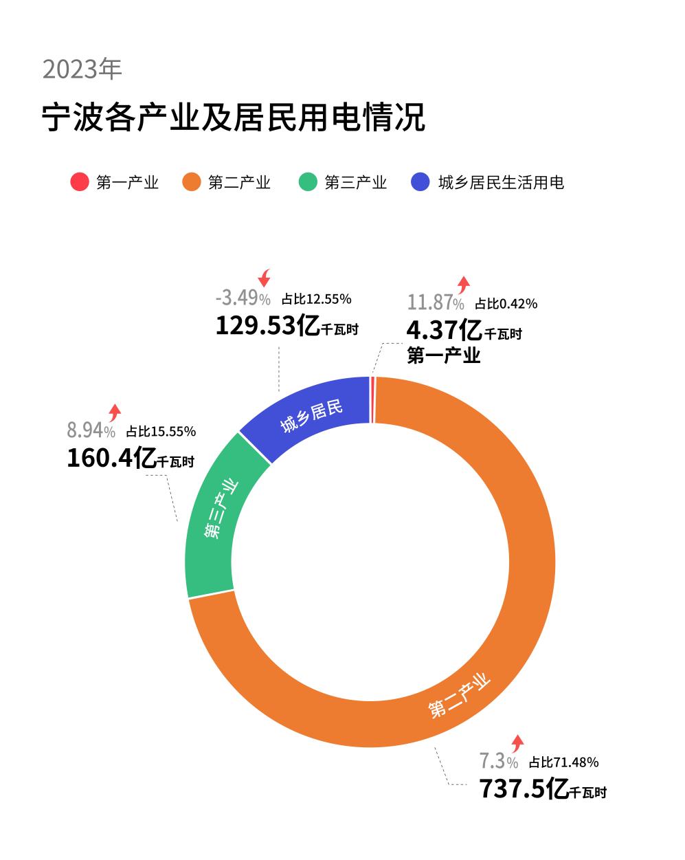 2023年一季度宁波全社会用电量同比减少0.94%,到上半年增长2.75%,前三季度增长4.73%,全年增长6.08%,用电量增长趋势与经济发展整体向上态势保持一致。宁波三大产业齐头并进,第一产业用电量4.37亿千瓦时,同比增长11.87%;第二产业用电量737.50亿千瓦时,同比增长7.30%;第三产业用电量160.40亿千瓦时,同比增长8.94%。