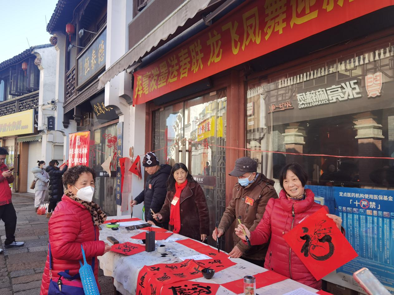 书法好手们挥毫泼墨,笔走游龙,不一会儿一句句新春寄语跃然纸上,湖城古街散发着清淡墨香,挂满了春联“福”字,现场一片浓浓的年味。参与活动的群众一边欣赏书法,一边品评着春联蕴含的吉祥寓意,墨迹未干便已被收入囊中。