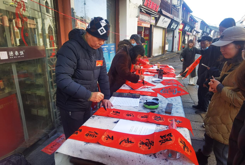 上联“诈骗手段万万千”,下联“捂紧钱袋不沾边”,横批“全民反诈”;上联“远离毒品千家喜”,下联“珍爱生命万户欢”,横批“天下无毒”……活动邀请湖州老年书画研究会书法老师挥毫泼墨,将饱含美好祝福的平安春联送给过路群众。