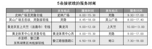 这次换乘服务中,有一条接驳线就是从黄龙洞站出发的,想要去灵隐、上天竺(法喜寺),可以在黄龙洞公交站上车,时间为9:00-12:00,上天竺公交站上车的时间为10:00-13:00。