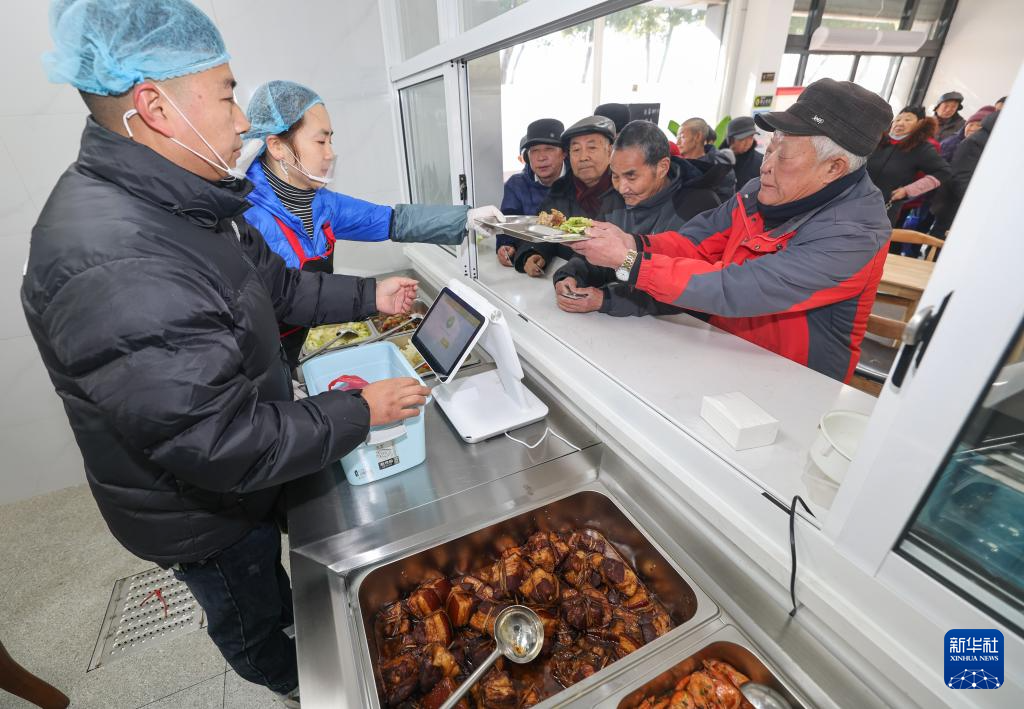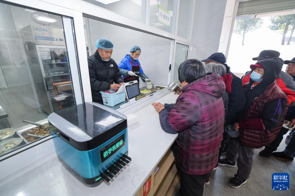 1月23日,老人们在嘉兴秀洲区新塍镇虹桥社区长者食堂内购餐。