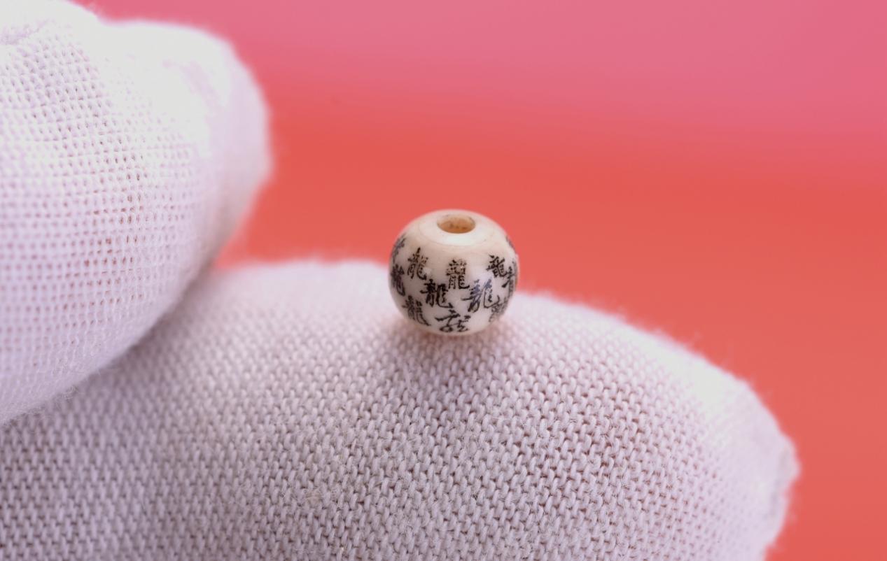 这件刻在猛犸象牙桶珠上的微雕,大小如同一粒绿豆。桶珠面上,自上至下刻上由正行草隶篆五体组成的二十四个“龙”字。