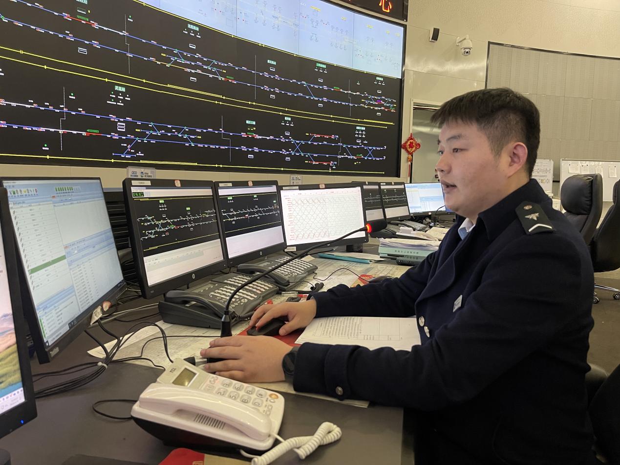 “20601次司机,请密切注意线路情况,遇线路结冰及时采取措施报行调。”行车调度员给司机发令。司机在确认具备发车条件后按下“发车”按钮,随着列车的缓缓启动,他向四周观察着轨道及设备是否有结冰情况,还时不时地看向车内的仪表盘、显示屏等设备,确保列车在驾驶期间保持正常的运行状态。