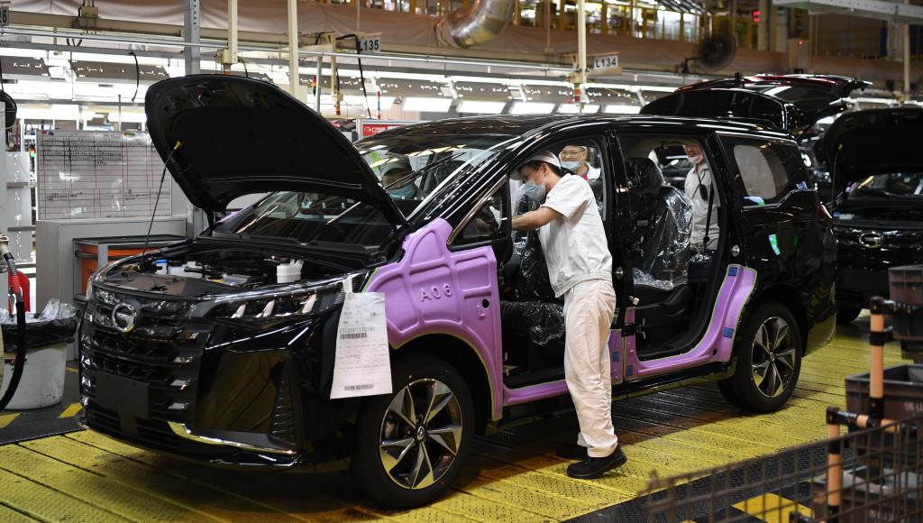 工人在位于广州的广汽传祺智慧工厂总装车间生产线上工作。新华社记者邓华 摄