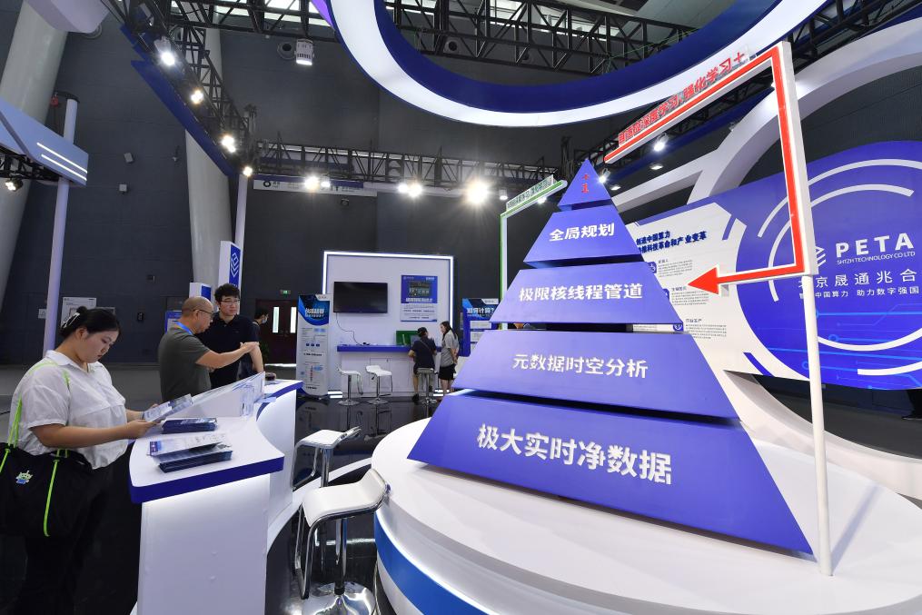 2023中国国际数字经济博览会上,北京晟通兆合科技有限公司工作人员(左二)向参观者介绍极限超算系统。新华社记者骆学峰 摄