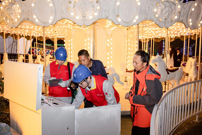 近日,国网瓯海供电分公司工作人员来到国家3A级旅游景区浙江温州云顶草上世界,对景区用电线路、配电设备安全运行情况进行检查,以电力服务助力城市打造文旅新“夜”态。