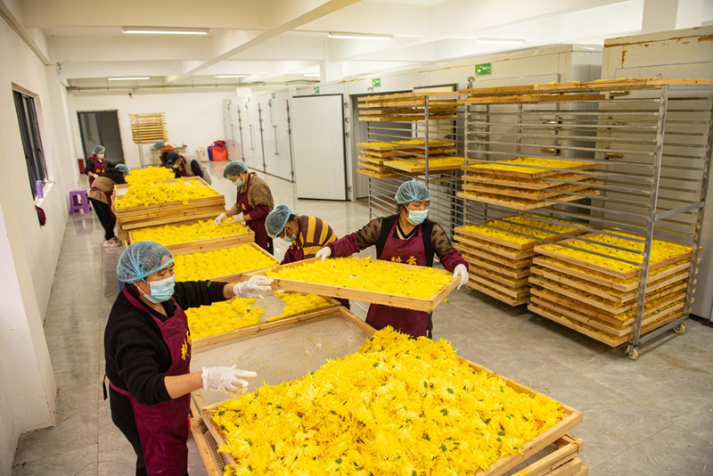 每年秋季,二源镇湖田村百亩金丝皇菊竞相绽放。当地村民便会抓住晴好天气,采收金丝皇菊并将其送往文瑞未来农业“共富工坊”进行分拣、烘干和包装。看着村民钱袋子越来越鼓,村党支部书记黄国炜感慨,“自从侨商郑明誉回乡创办了文瑞未来农业‘共富工坊’,不仅调动村民种植的积极性,还让金丝皇菊产业越做越大。”