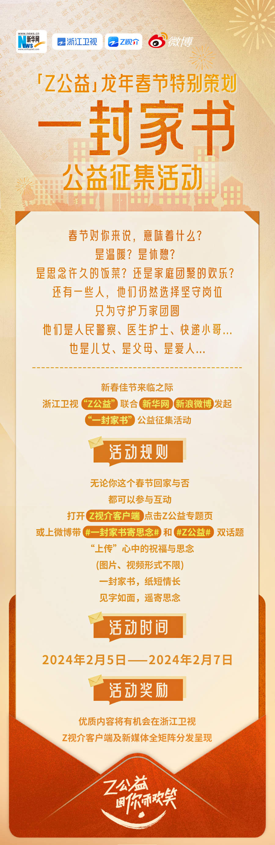 春节将至,团圆是游子共同的期盼。不管你是否回家,都可以用家书来传递祝福与思念。新华网、浙江卫视Z公益、微博综艺联合发起的龙年春节特别策划“一封家书”公益征集活动今日上线。