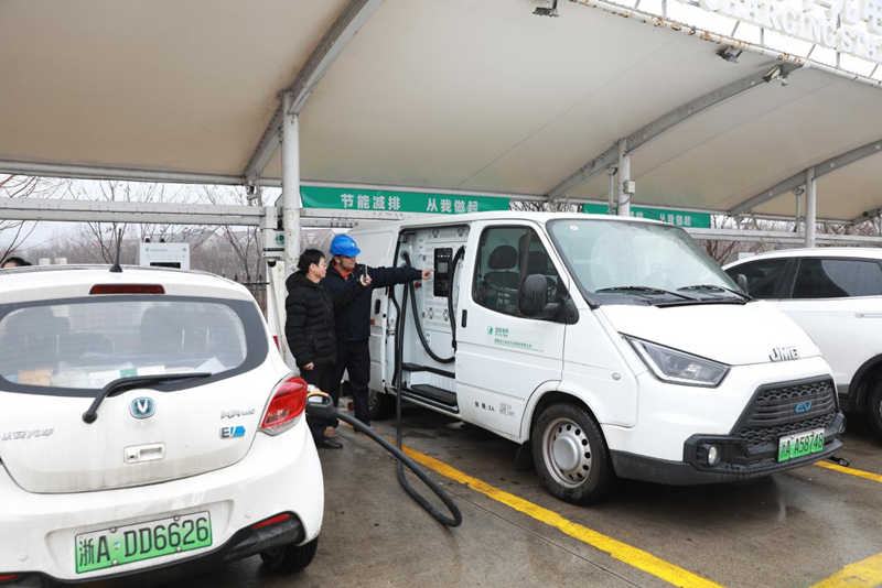 在服务区,国网杭州市萧山区供电公司员工孔锛涛正在指导蒋先生使用移动充电车充电。蒋先生将挂在应急车上的充电枪取下,插入自己新能源车的充电口中,随后他用手机扫码启动了充电程序,车子的液晶屏便跳出充电提醒。