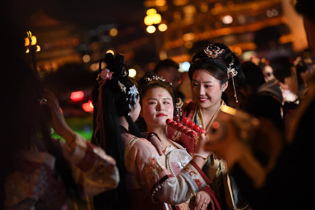 在全国最大的汉服生产基地山东菏泽曹县大集镇,电商主播们正忙着向消费者介绍今年新推出的龙年拜年服。