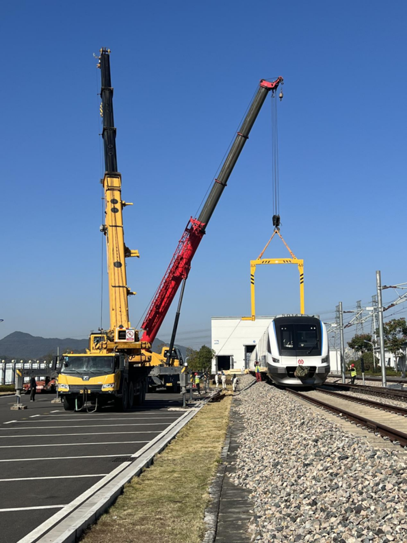 在DCC(车辆段控制中心)的指挥下,等待高级修的市域动车组通过调车作业转移至桐岭车辆段临修库中进行入修准备,检修人员拆卸车上的所有设备并进行装包工作,原本紧密相连的四节编组列车被一一拆分,通过两台重型吊机互相配合将其分别装载在四辆重型拖车之上,最终发运至修造基地进行高级修工作。