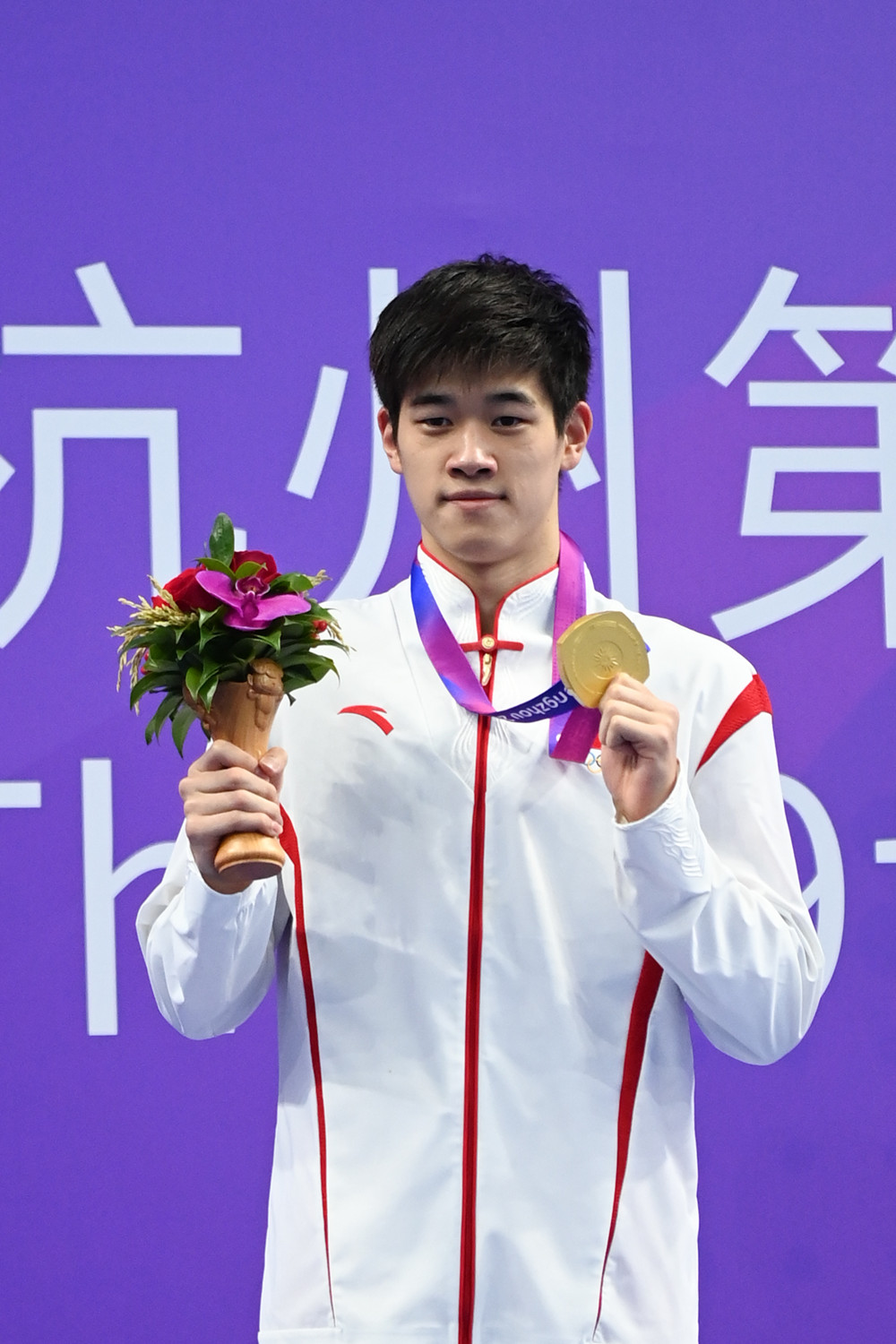 2023年9月24日,冠军中国选手潘展乐在颁奖仪式上。潘展乐以46秒97的成绩获得冠军并创造男子100米自由泳新的亚洲纪录。新华社记者 黄宗治 摄