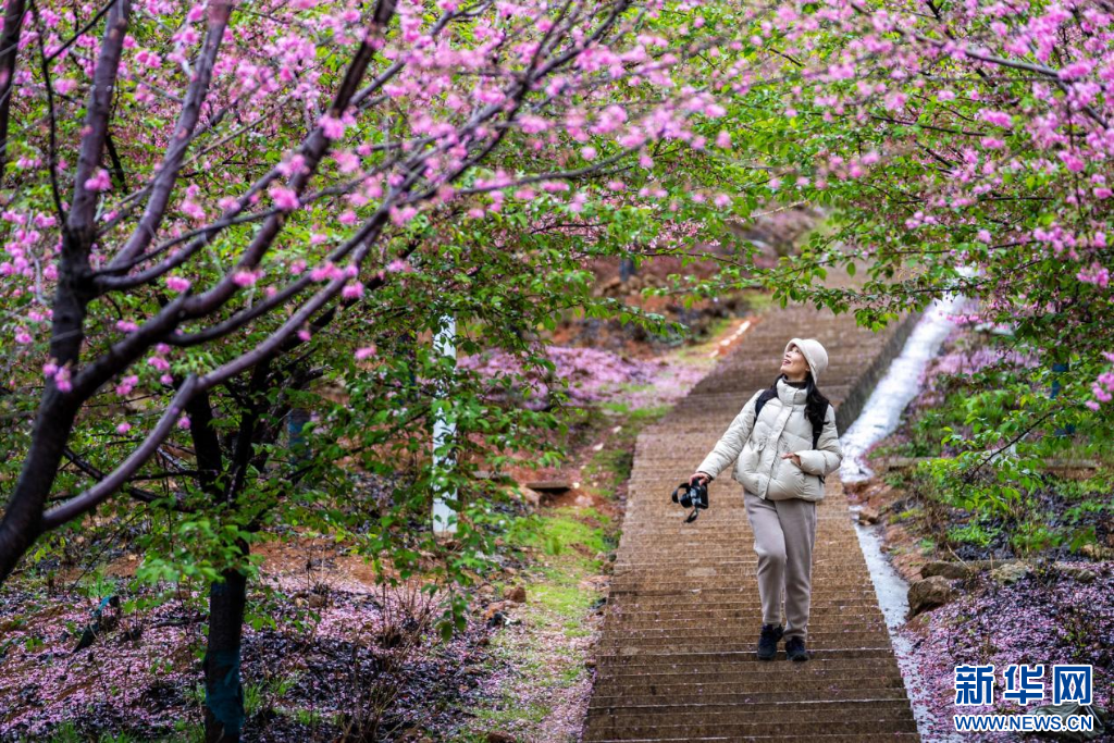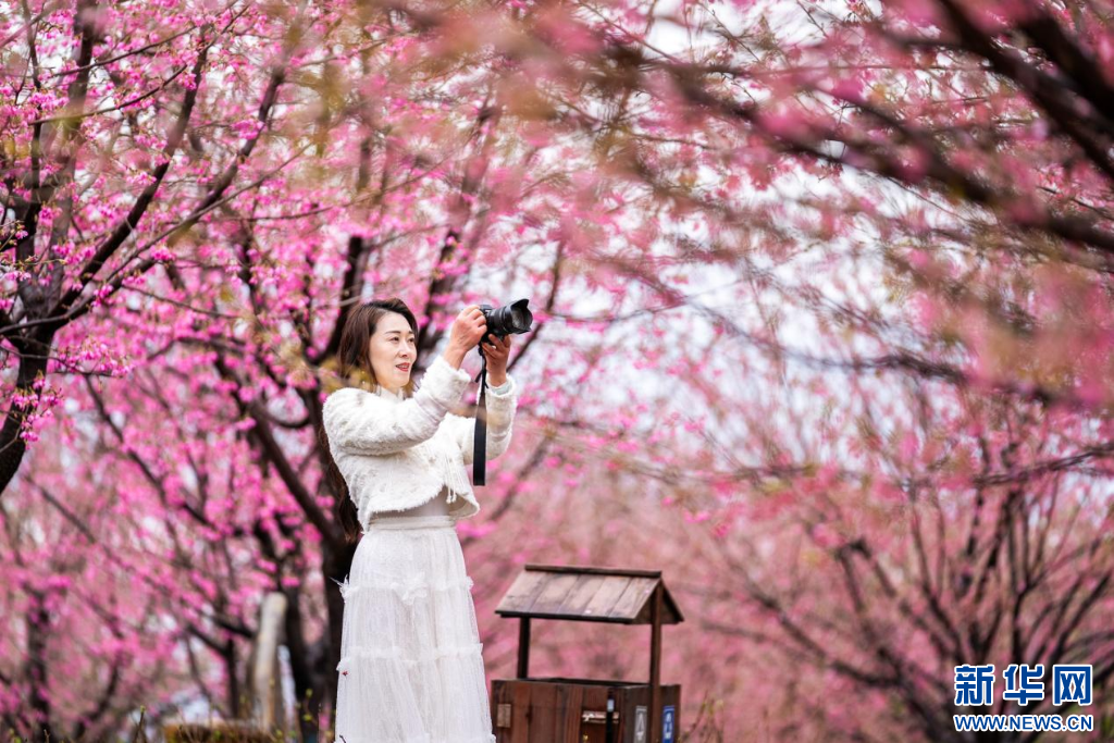 大地春回,浙江温州瑞安市桐浦凤凰樱花谷一片绯红,如霞似锦。樱花谷中,河津、香水、富士等十几个品种的千亩樱花竞相绽放,满目绚烂。漫步在樱花大道,春风中轻轻摇曳的樱花令人神怡心醉,游客纷纷驻足拍照,留下美好瞬间。据了解,桐浦凤凰樱花谷通过不同花期组合,园区花期延长到了4月中旬。