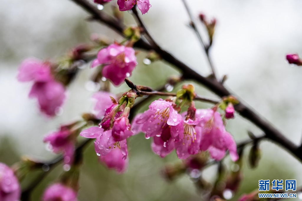 雨中绽放的樱花更显娇嫩可人。