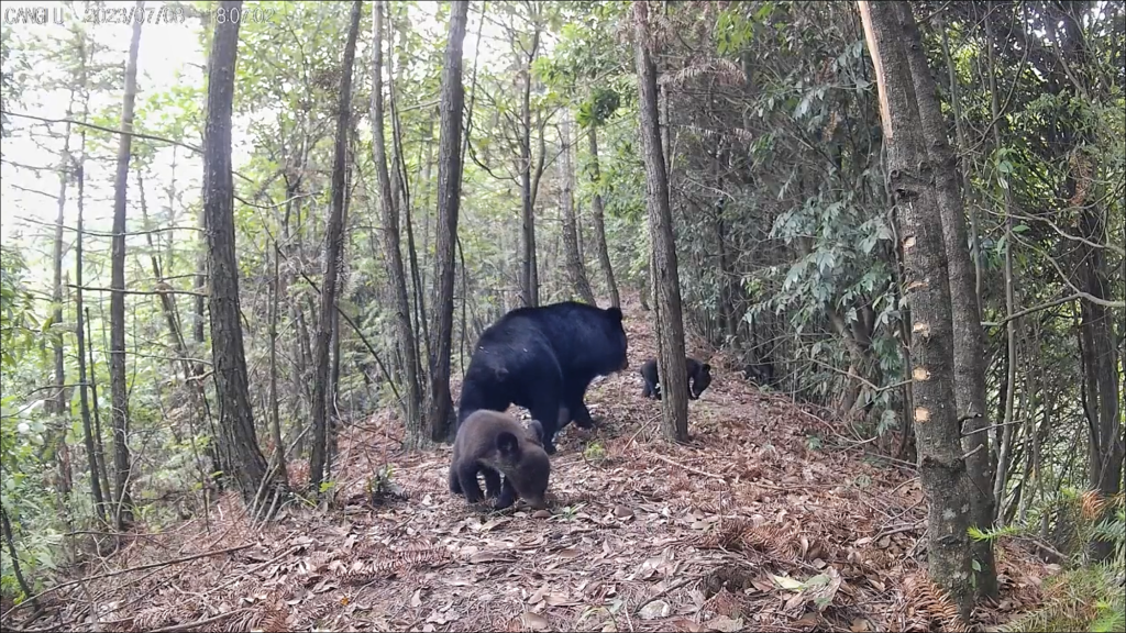 在钱江源国家公园,红外相机拍摄到一只成年雌性亚洲黑熊正带着两只幼崽遛弯觅食。新华社发