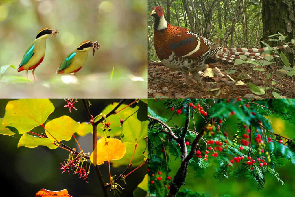 钱江源国家公园内的八色鸫(左上)、白颈长尾雉(右上)、长柄双花木(左下)、南方红豆杉(右下)。新华社发