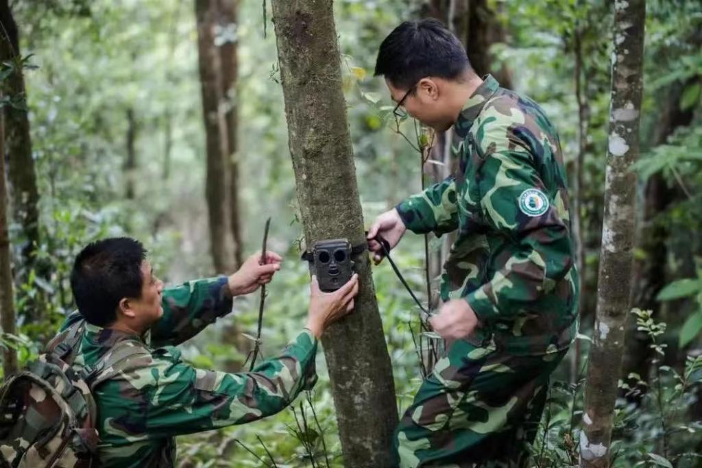钱江源国家公园管理局科研监测中心工作人员在安装红外相机。新华社发