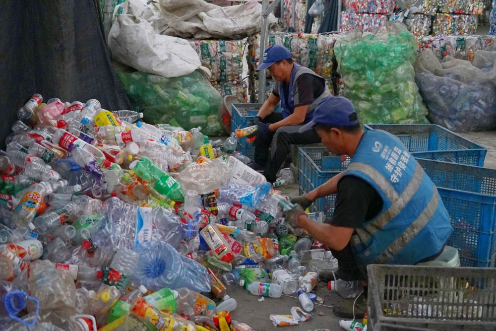 “蓝色循环”项目的工作人员在分拣收集到的废弃塑料瓶(林光耀 摄)